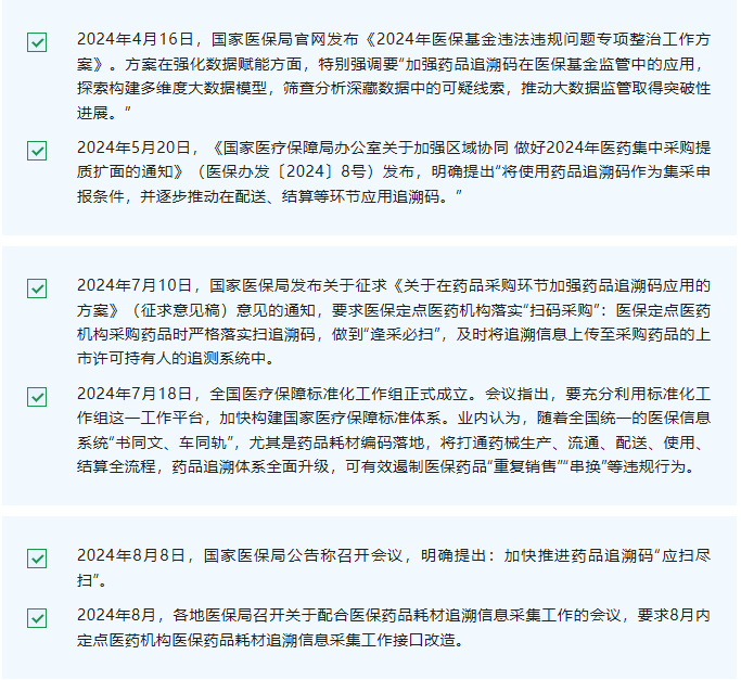 2024年,国家药监部门和医保局在药品追溯码管理方面迈出了重要步伐。这些政策要求: