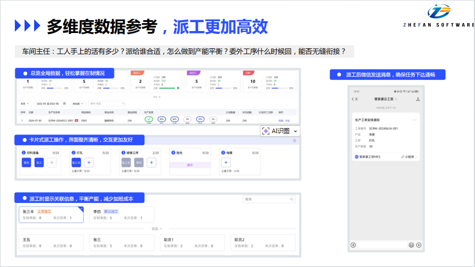 派工环节采用卡片式操作,界面清晰直观,能实时显示员工在制单数、历史加工记录、技能熟练度等信息,方便我平衡各工位产能,合理分配任务,避免部分员工忙到通宵、部分员工无所事事的情况。派工后系统还会通过微信自动发送通知给员工,明确任务内容、完成时限,避免信息脱节导致工期延误。