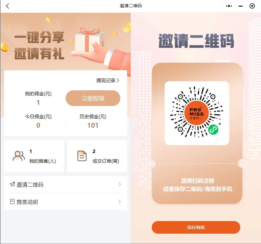 客户可以通过分享专属邀请码实现拓客的需求,商城系统自动记录推客人数,并计算出提成,当完成上下级关系的绑定,在交易后自动进行分润。