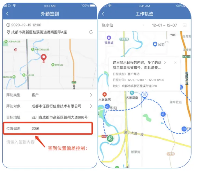 外勤签到+打卡:外勤位置偏差控制,外勤拍照图片上传控制,严控销售人员异常签到,杜绝虚假拜访,全程记录销售人员行动轨迹和停留时长,回溯人员工作记录