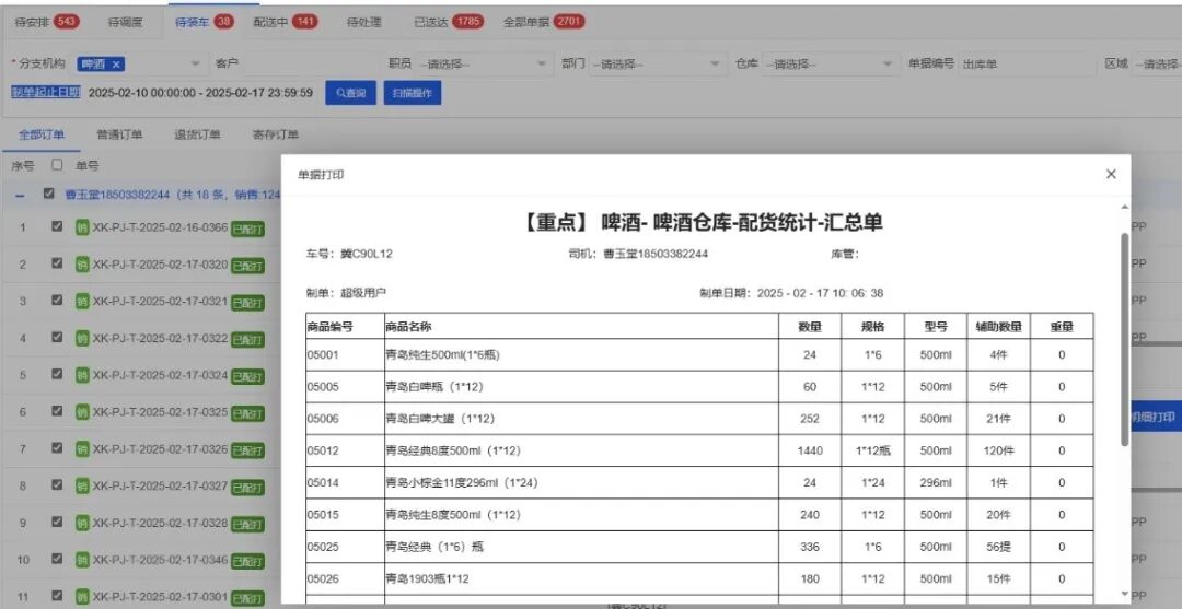 利用简为快消的配货汇总功能,企业可以在第二天依据前一日的所有业务单据,迅速完成货物的扫描与分配,并生成汇总详细的装车清单。减少了人工统计、汇总商品数量所需的时间,还保证了发货的准确性。